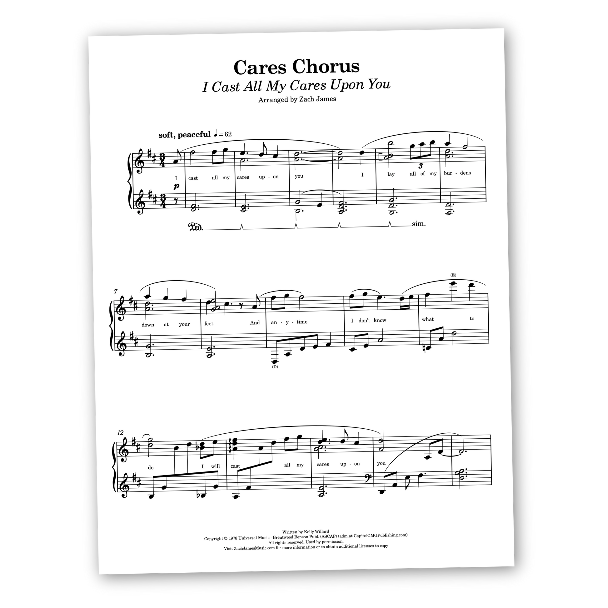 A tender and meditative arrangement of the worship song, Cares Chorus by Kelly Willard. With an uncomplicated accompaniment to support an eminently gorgeous melody, this setting captures the heartfelt simplicity of this prayer. Perfect for quiet moments and reflective contexts, this intermediate-level arrangement is sure to make your heart sing if not your voice too.