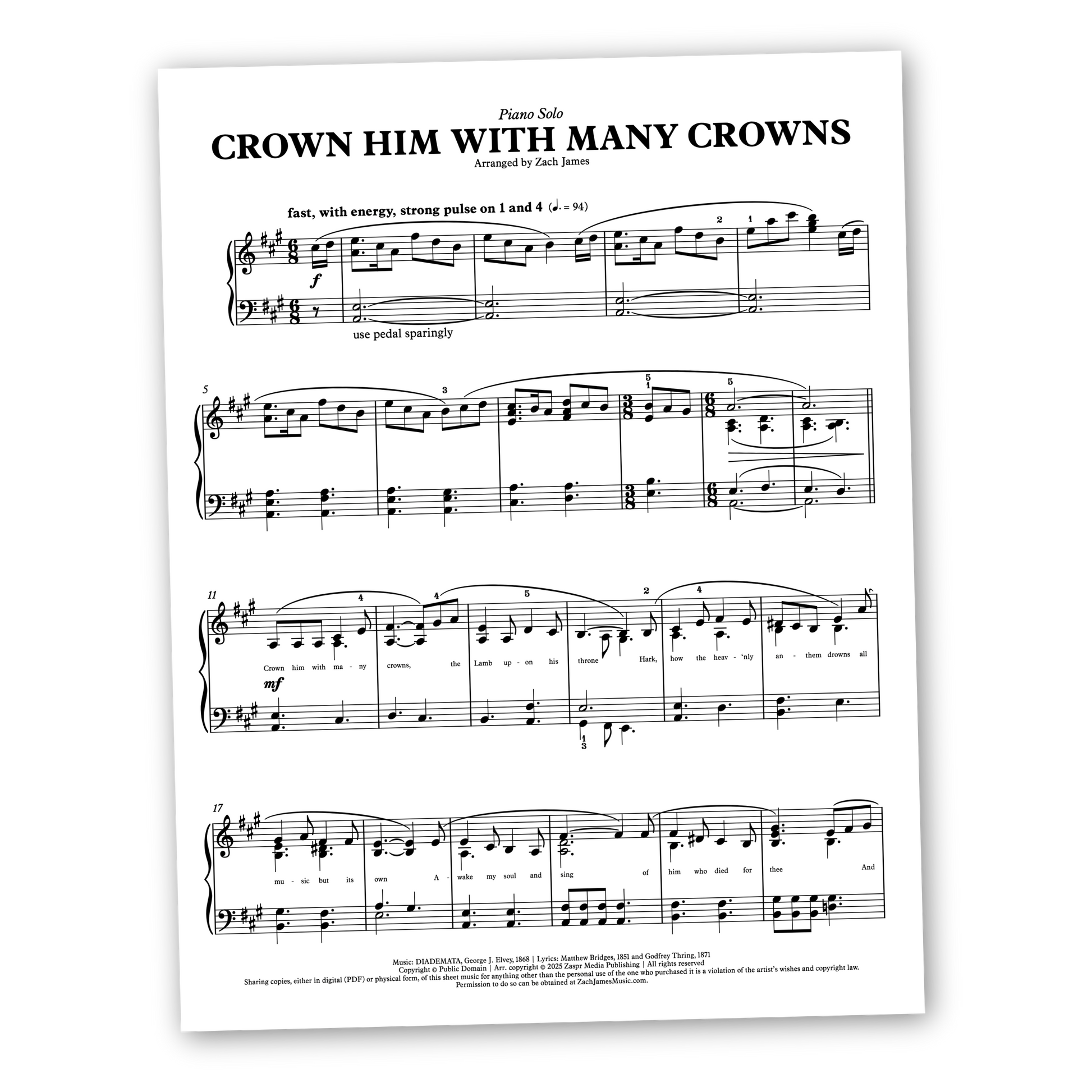 A fun and triumphant arrangement for piano solo of the hymn, Crown Him With Many Crowns. Drawing on traditional Celtic dance music, this setting features a rousing flute-like jig and transforms the original 4/4 meter into an exhilarating 6/8 meter. With lots of energy and dynamic contrast, this arrangement for advanced pianists is an absolute joy to play and an inspiration to listen to.