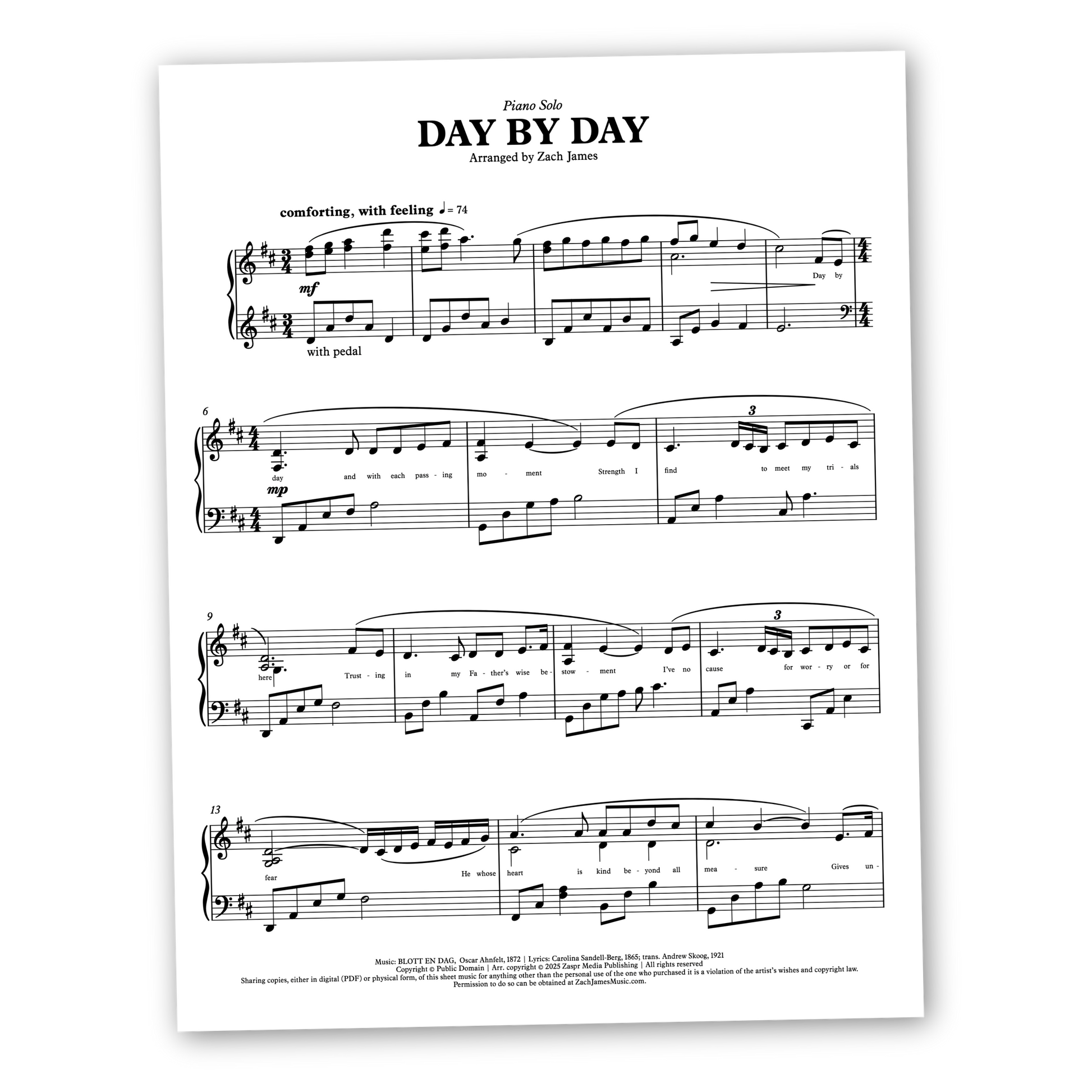 A warm and inviting arrangement for piano solo of the hymn, Day By Day. As comforting as the lyrics, this setting features an intuitive accompaniment and welcoming theme, beckoning listeners to sing along. For intermediate pianists, it's perfect for preludes, offertories, or times of meditation.