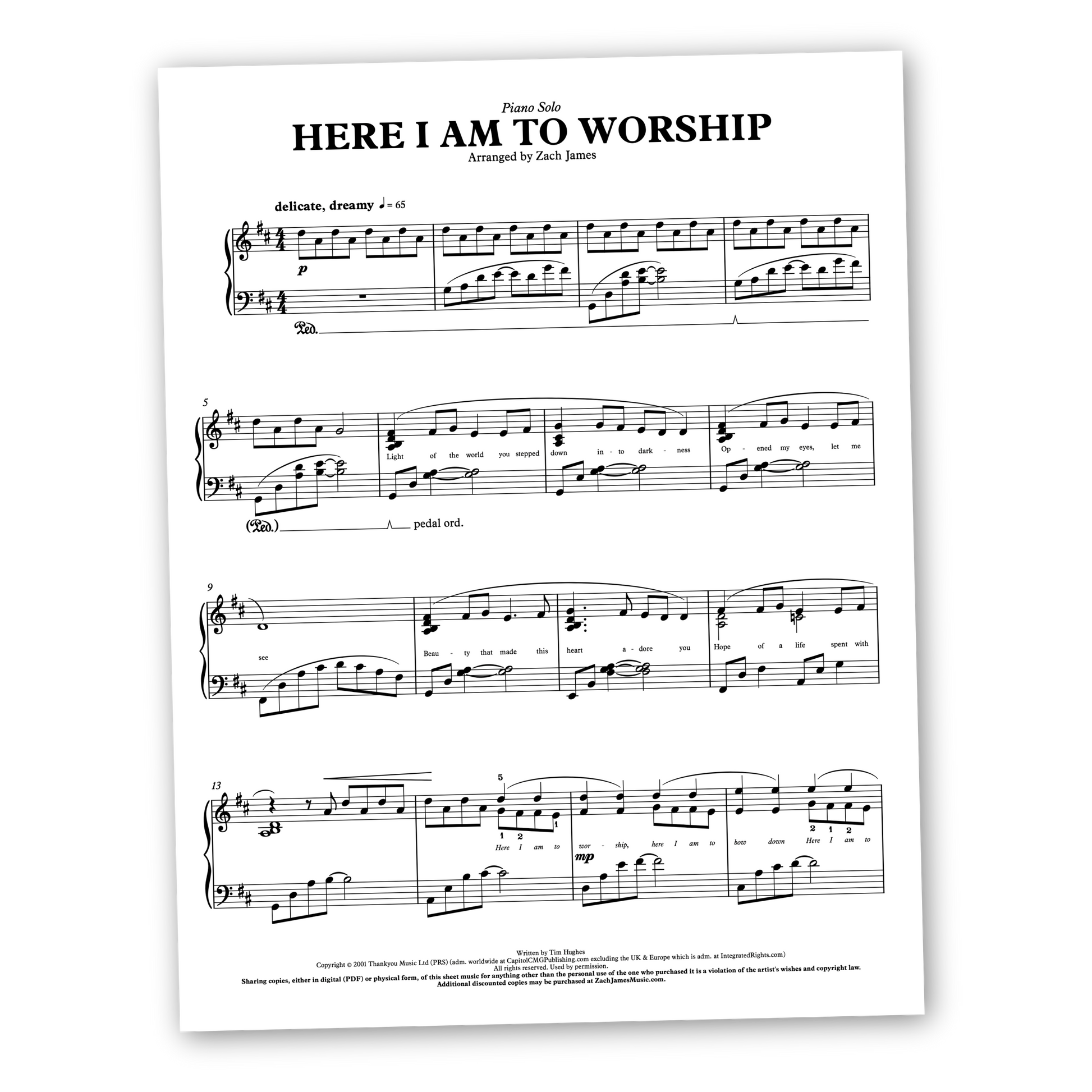 A delicate and dreamy setting for piano solo of the worship song, Here I Am to Worship by Tim Hughes. Featuring verses that float, choruses that sail, and an instrumental section that soars, a song as heartfelt as this one deserves an arrangement that accentuates its simple beauty. For intermediate pianists, it's ideal for preludes, special music, personal meditation, or reflective contexts.