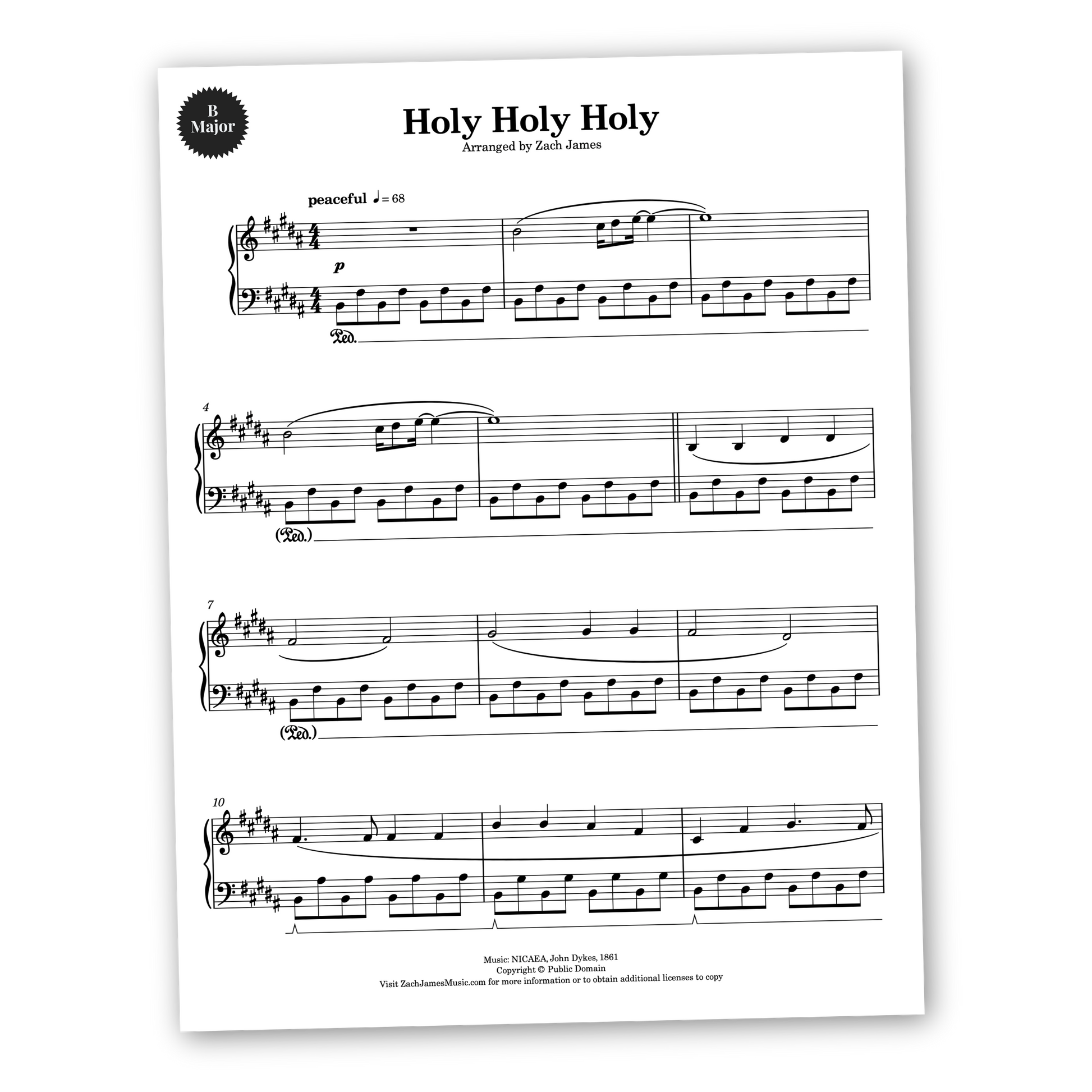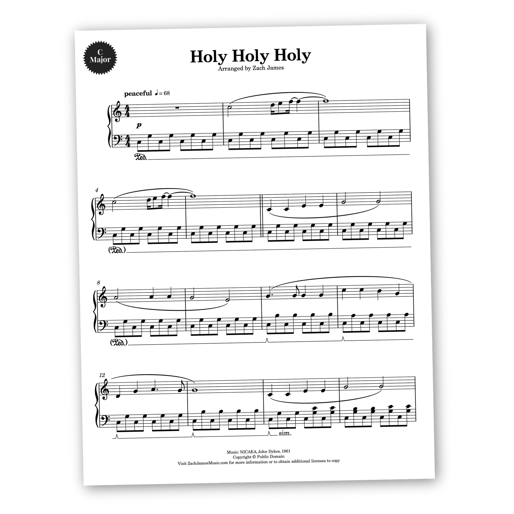 A peaceful arrangement for piano solo of the hymn, Holy Holy Holy. A dreamy, oscillating accompaniment paired with a heavenly melodic intro give this normally triumphant hymn a fresh, meditative character. For intermediate pianists, it's a very satisfying and enjoyable piece to play. Purchase includes sheet music in two keys: B Major (original) and C Major.