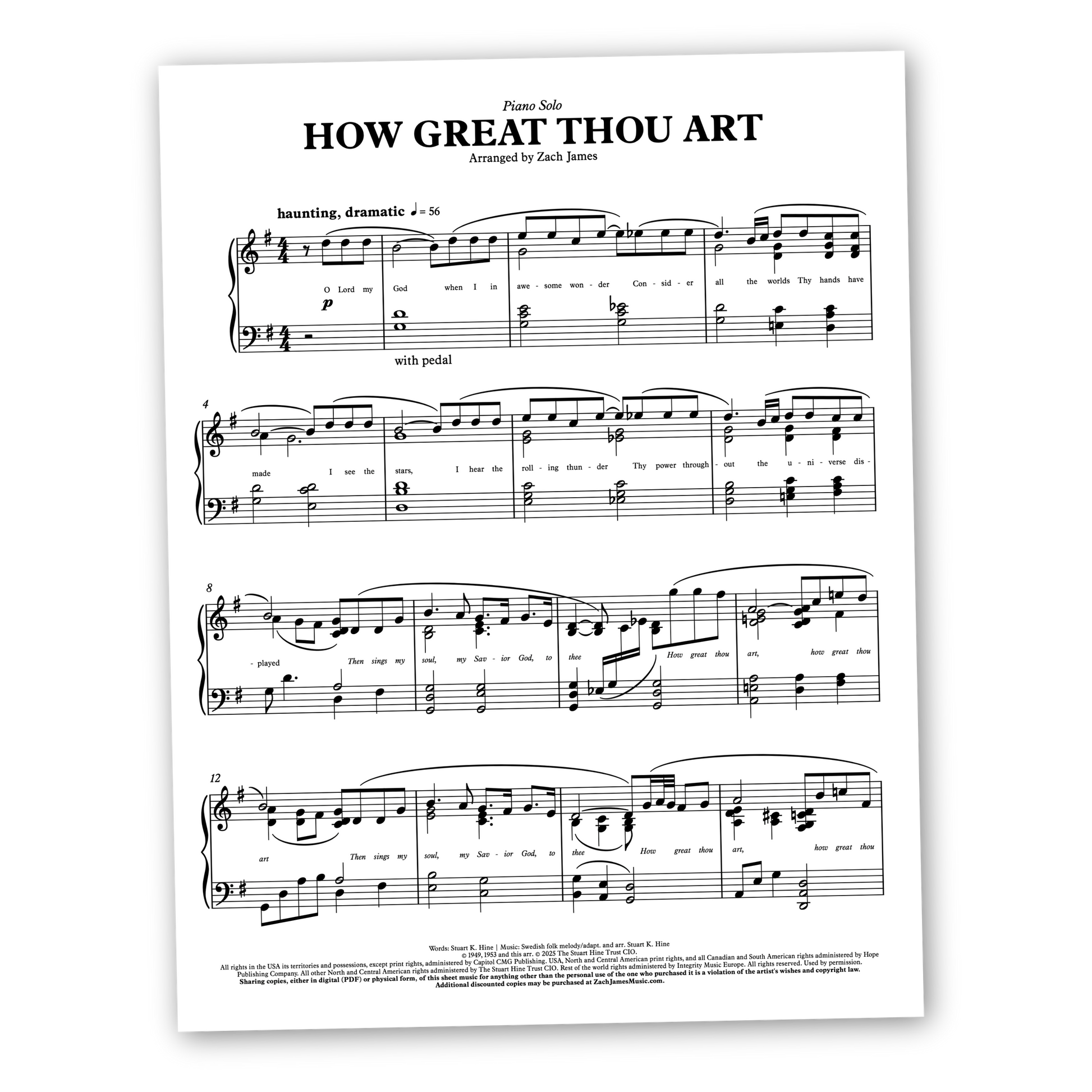 An exotic and inspirational arrangement for piano solo of the hymn, How Great Thou Art. Borrowing from the minor key, this setting features haunting re-harmonizations and a powerful instrumental section. For late-intermediate/early-advanced pianists, this rendition is sure to awe and inspire.