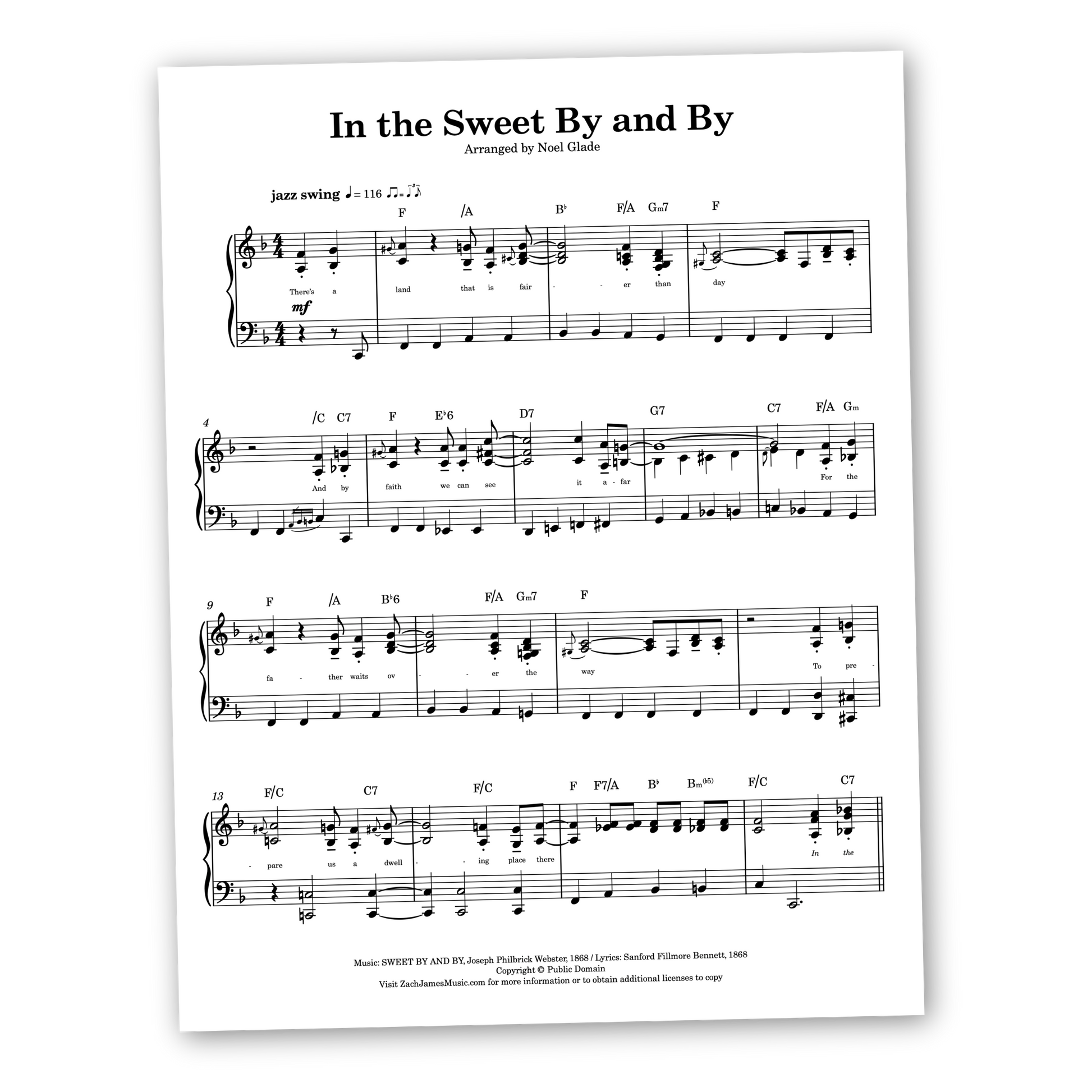 From Noel Glade, a lively jazz setting for piano solo of the hymn In the Sweet By and By that is fun and accessible for intermediate level pianists. Whether you're a classically-trained note reader looking to branch into other genres or simply looking for something to lighten up a special event, this arrangement is stylistic and a blast to play!