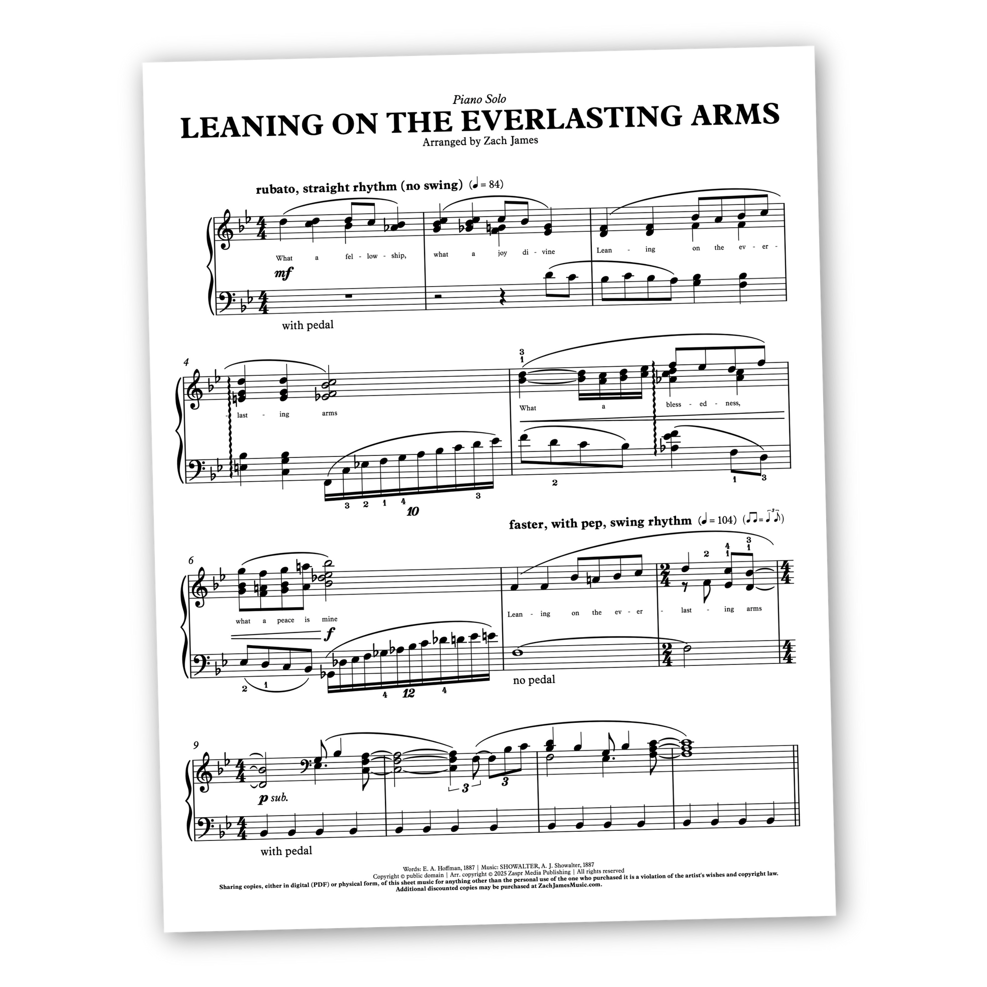 A fun, peppy, and playfully dramatic arrangement for piano solo of the hymn, Leaning on the Everlasting Arms. A veritable playground for pianists, featuring lots of variety in style, rhythm, and dynamics, this setting for late-intermediate pianists is an absolute blast to both play and listen to. Perfect for solo performances, recitals, preludes, or, of course, personal enjoyment.