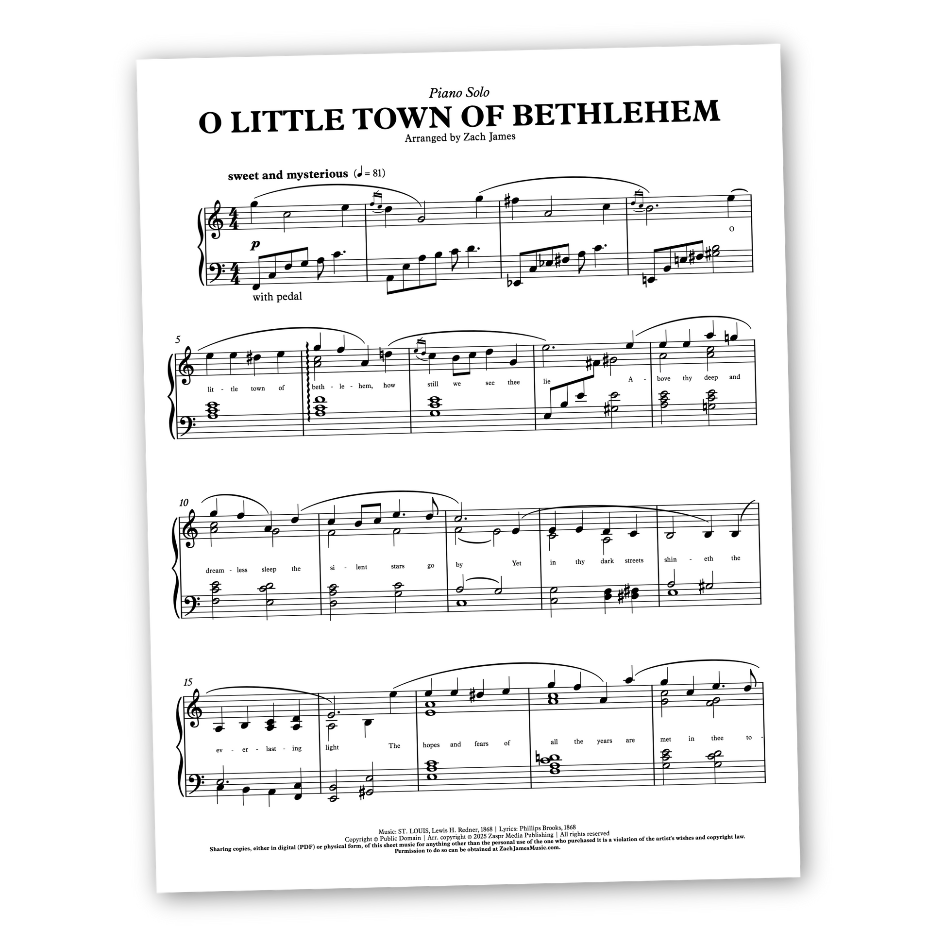 A sweet and mysterious arrangement for piano solo of the Christmas carol, O Little Town of Bethlehem. As if you yourself were entering that ancient town filled with fear and trepidation mixed with a bit of hope, this setting interposes a beautiful and tender melody with dark and unsettling harmony to create a world of color and texture. For intermediate-level pianists.